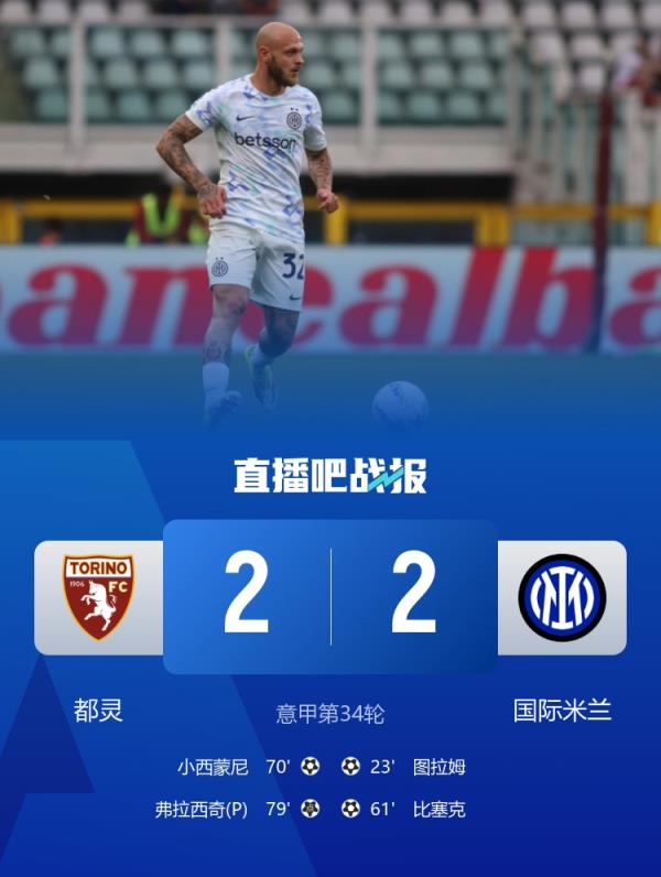 国米2-2战平都灵,意甲剩4轮10分领跑!