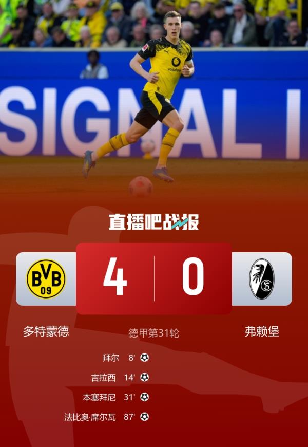 多特蒙德4-0弗赖堡,结束两连败,领先第三名5分。